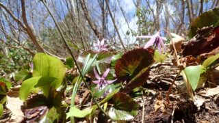 4月9日の火打池の様子です。池はまだ雪の中ですが、山の中にはあちらこちらにカタクリが咲いていました。